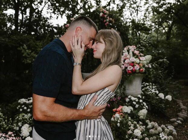 En una de las fotos se aprecia el anillo de compromiso, una banda dorada con un imponente diamante central, mientras que en otra aparece Kelce de rodillas en un jardín decorado con flores blancas, rojas y rosas, en lo que habría sido la romántica propuesta.