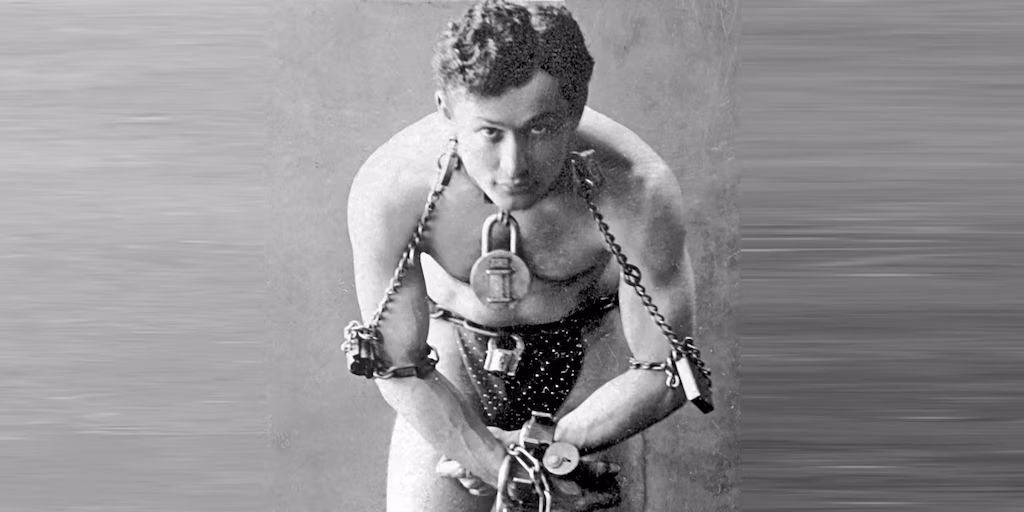 Se suele considerar a Houdini el mejor escapista de todos los tiempos y también precursor de muchas de las hazañas y retos de este tipo. Escapó de cuerdas, cadenas, camisas de fuerza, todo tipo de esposas, barriles, cajas, baúles, bidones, bolsas, sacos, ataúdes, jaulas y habitaciones cerradas.