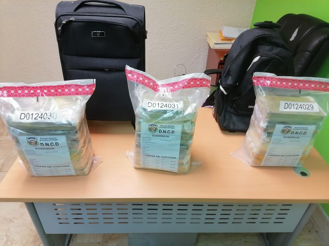 "En el interior de la maleta se decomisaron doce (12) paquetes, mientras que en la mochila se incautaron otros seis (6) bloques del polvo blanco, con un peso preliminar de 18. 90 kilogramos" señala el comunicado de prensa.