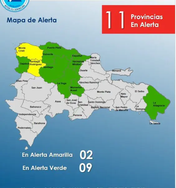 En alerta amarilla se encuentra Santiago Rodríguez y Monte Cristi, mientras que en verde está Puerto Plata, Valverde, Espaillat, Hermanas Mirabal, Santiago, La Vega, Monseñor Nouel, Dajabón y La Altagracia.
