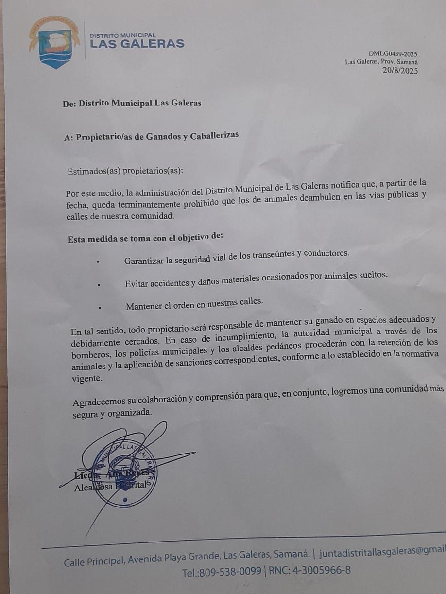 Las Galeras, Samaná.– La alcaldesa de Las Galeras, Ana Reyes, informó a la ciudadanía y a los propietarios de ganado y caballerizas que, a partir de la fecha, queda terminantemente prohibido permitir que animales deambulen en las vías públicas de la comunidad.