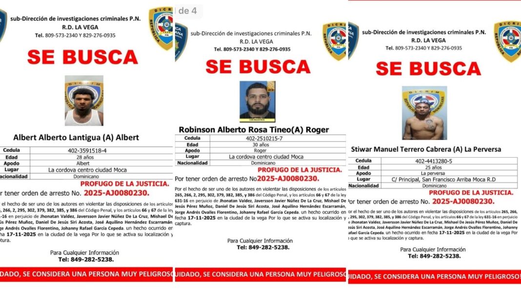 La subdirección de Investigaciones Criminales (Dicrim) de la Policía Nacional, con asiento en La Vega, emitió este viernes tres afiches de búsqueda en los que solicita la colaboración ciudadana para localizar a tres hombres señalados como prófugos de la justicia, según los documentos oficiales difundidos por la institución.