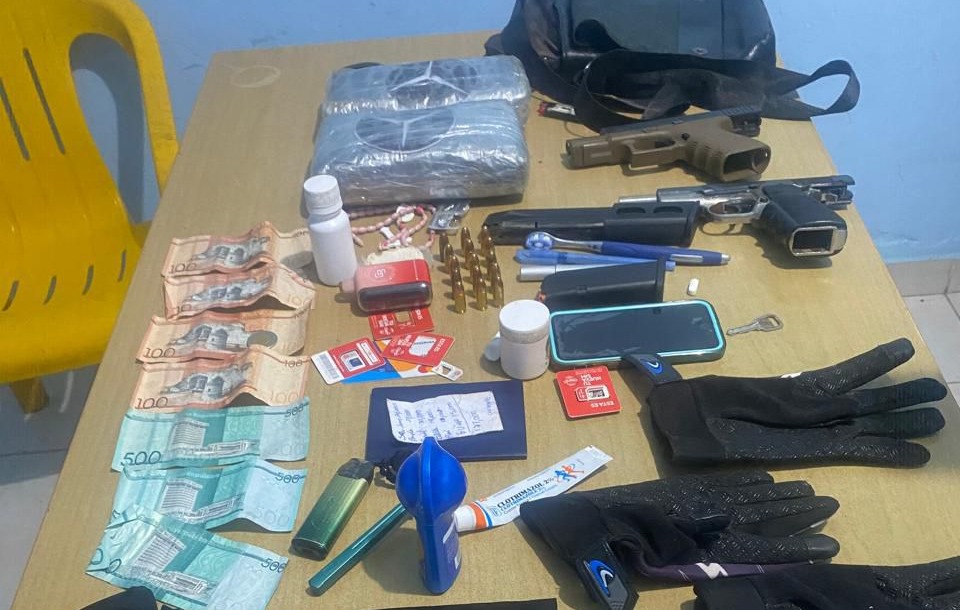 Durante la actuación policial fueron ocupados dos kilogramos de un polvo blanco, presumiblemente cocaína, envueltos en cinta adhesiva, así como dos armas de fuego ilegales: una pistola Glock, calibre 9mm, con su cargador y siete cápsulas, y otra Browning, calibre 9mm, con un cargador de capacidad para 30 cápsulas.